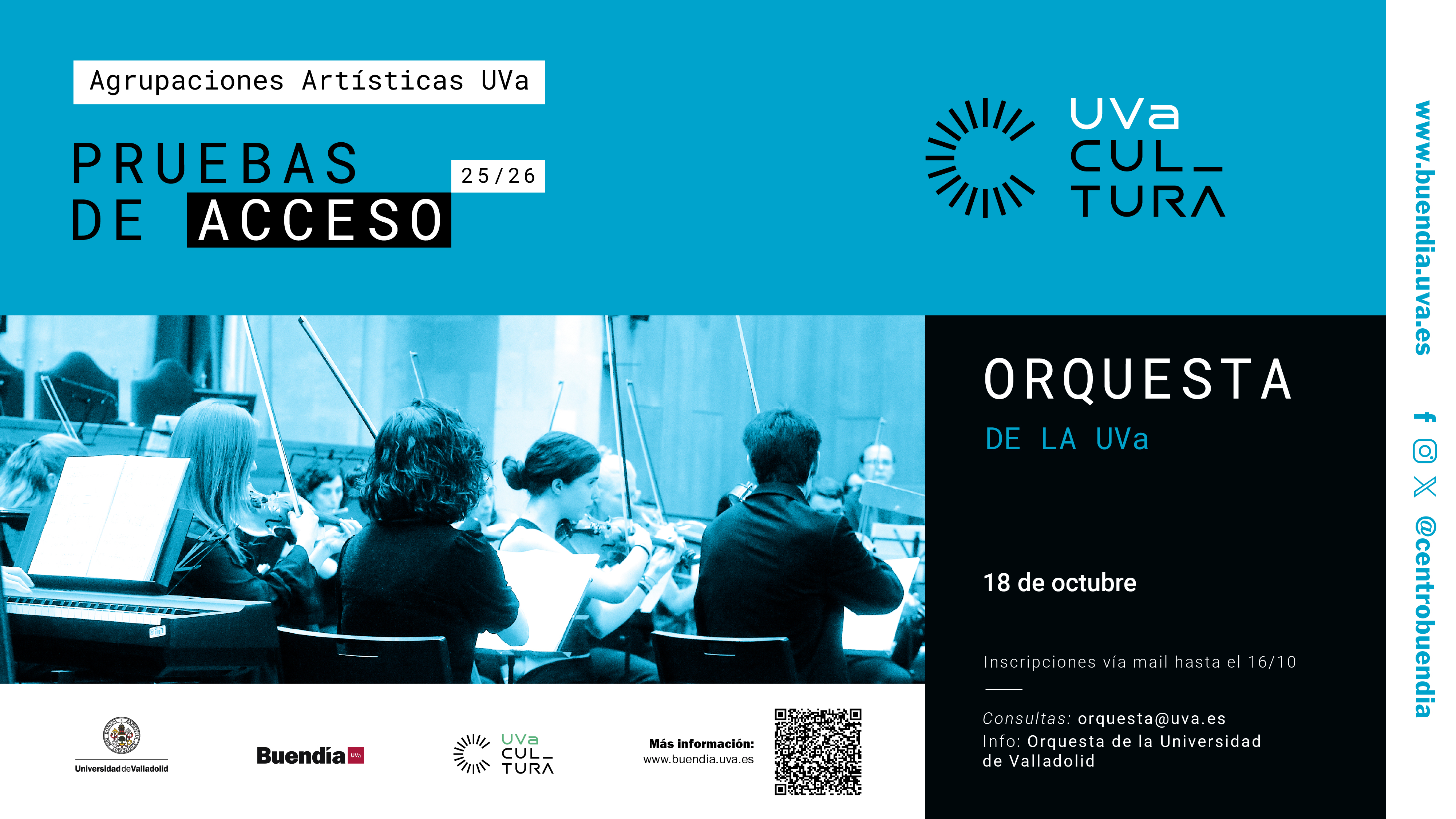 Envía un correo a orquesta@uva.es con el título Pruebas de acceso 2025/26, tienes hasta el 16 de octubre de 2025 para hacerlo. En él, además de tu CV musical, debes indicar: